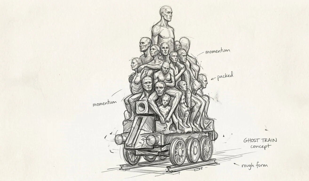 The "Ghost Train" direction represents the momentum of a life travelled. It is the blur of history, the speed of memory, and the "jibs" of an emotion that can no longer be contained by a nose, an eye, or a limb. It is the human essence caught in mid-motion.